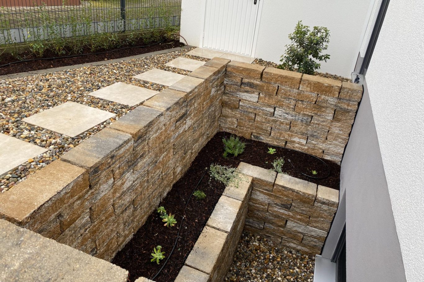 Gestalten Sie Ihren Außenbereich mit einer individuell gestalteten Terrasse und einer robusten Natursteinmauer.